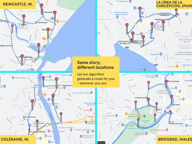 This is not a walking tour. Rather our algorithm will anchor the narrative around the points near you - transforming your everyday locale into an immersive audio experience. Mystery Mile is global and can be used anywhere in the world and our aim is that people can use it to explore the cities, towns and villages right on their doorstep in a new way. The walking routes open up new areas, make the familiar new, and, potentially, take app users into new territory. This removes barriers and preconceptions as walkers enter different areas without stigma and preconceptions.